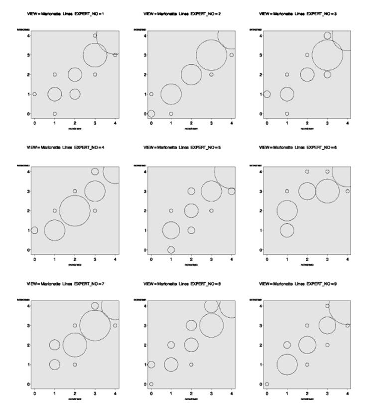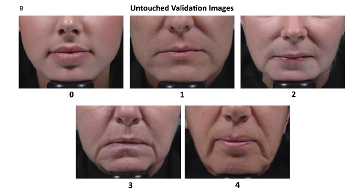 開發了一個五級圖譜評分量表(5-point photonumeric rating scale),用于客觀量化木偶紋(Melomental folds)的嚴重程度。9位專家對35名受試者的照片進行了兩次評估,分別比較了原始圖譜與演變圖譜中的木偶紋(marionette lines)。通過計算組內相關系數來評估組間和組內的變異性。
