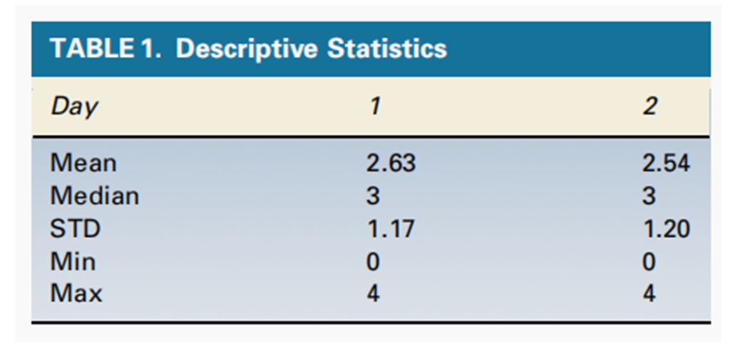 對每日評分進行描述性統計(標準差、平均值、中位數、最大值和最小值)計算(見表1)。評級的穩定性以雙變量散點圖(氣泡圖)的形式進行可視化。氣泡圖是一種在散點圖上表示變量間關系的方法。兩個變量的觀測值以常規方式繪制,使用圓圈作為符號;圓圈的半徑與第三個變量的關聯值成比例。給定分數的頻率決定了氣泡的大小,這些氣泡理想地位于對角線上。
