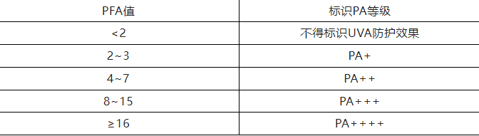 PA(長波紫外線防護指數(shù)分級):是以“+”表示產(chǎn)品防御長波紫外線UVA的能力,評價防曬化妝品防止皮膚曬黑能力的防護指標。PA等級越高,防止皮膚曬黑效果越好。如PFA值為6,表示使用該產(chǎn)品時,可以防御長波紫外線延緩皮膚曬黑時間6倍。例如:如果在某強度的陽光下暴露1 小時會引起皮膚曬黑,那么PFA值為6的防曬霜可將曬黑時間延長至6小時。我國法規(guī)要求PA標識以產(chǎn)品實際測定的PFA值為依據(jù),根據(jù)防曬能力可標注范圍為PA+~PA++++。