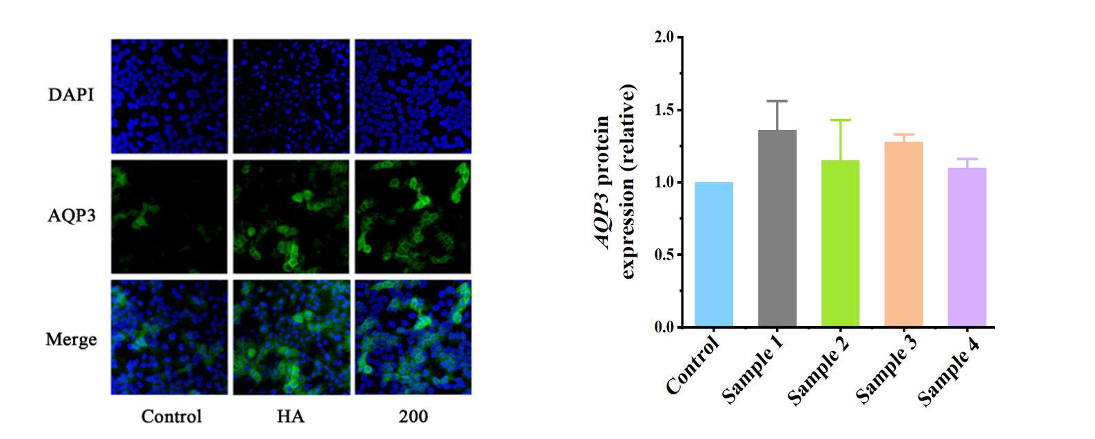 AQP3(水通道蛋白)主要參與細(xì)胞水和甘油的重吸收,AQP3表達(dá)的上調(diào)表征細(xì)胞保濕能力和屏障功能的增強(qiáng)。HAS3(透明質(zhì)酸合成酶)主要參與透明質(zhì)酸的合成,透明質(zhì)酸是一種良好的保濕成分,合成越多保濕效果越好。絲聚蛋白(FLG)是角質(zhì)層的重要成分,由角質(zhì)形成細(xì)胞合成,并隨角質(zhì)形成細(xì)胞遷移過程逐漸被酶降解為天然保濕因子等角質(zhì)層需要的小分子物質(zhì),在保濕、修護(hù)和屏障完整性方面發(fā)揮重要作用。
