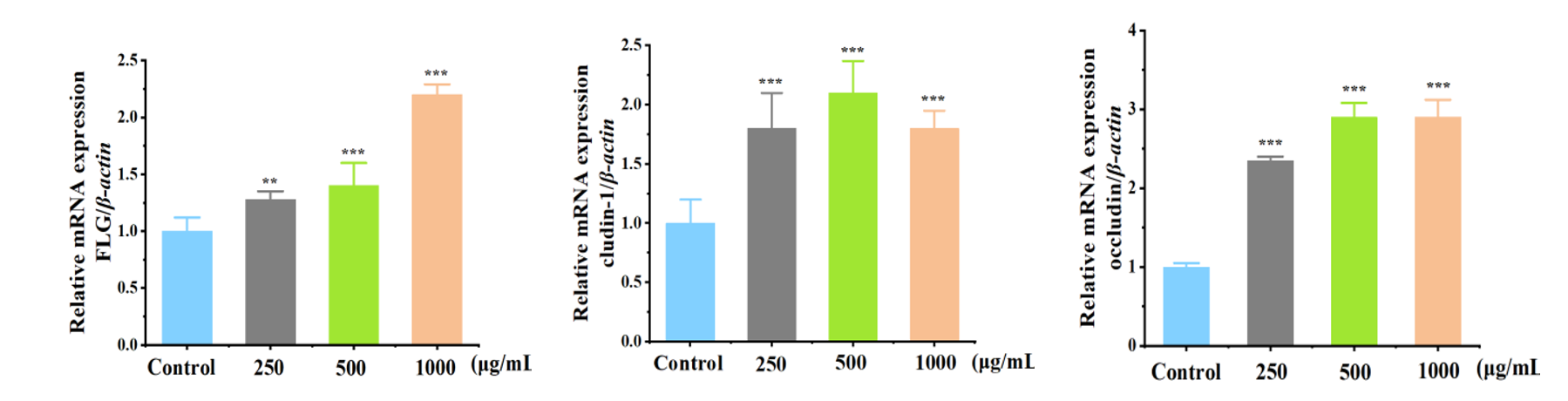 如圖,與對照組相比,隨著樣品濃度的上升,屏障相關(guān)基因表達(dá)逐漸升高,表明樣品能夠有效促進(jìn)細(xì)胞保濕和修護(hù)。
