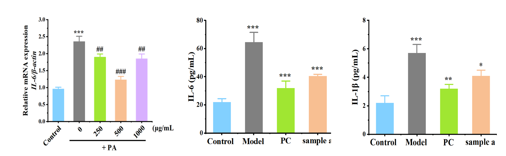 與模型組相比,加入樣品后炎癥因子含量和基因表達(dá)明顯下降,表明樣品具有一定的抗炎修護(hù)功效。