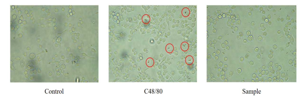 皮膚在外界環(huán)境刺激下,會激活肥大細(xì)胞進(jìn)而引起其活化、脫顆粒等情況。通過C48/80誘導(dǎo)肥大細(xì)胞活化脫顆粒,使用樣品后脫顆粒數(shù)量明顯減少,表明樣品具有良好的舒緩功效。