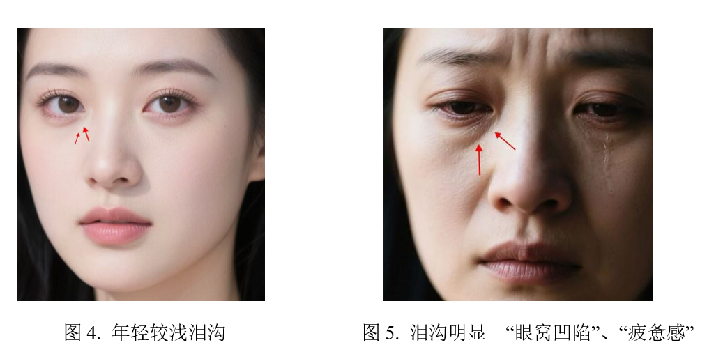 定義 | 淚溝是位于內眼角(內眥)開始,沿眼眶下緣向外下方延伸至面頰的一條結構性凹陷,屬于面部自然解剖結構的過渡線。正常情況下較淺,但隨年齡增長或特定因素可能加深,形成明顯的陰影或凹陷。 | 淚溝紋是淚溝區域表面的皮膚皺紋或細紋,通常因皮膚老化、干燥或表情習慣導致,表現為淺表的紋路,而非深層凹陷。 |