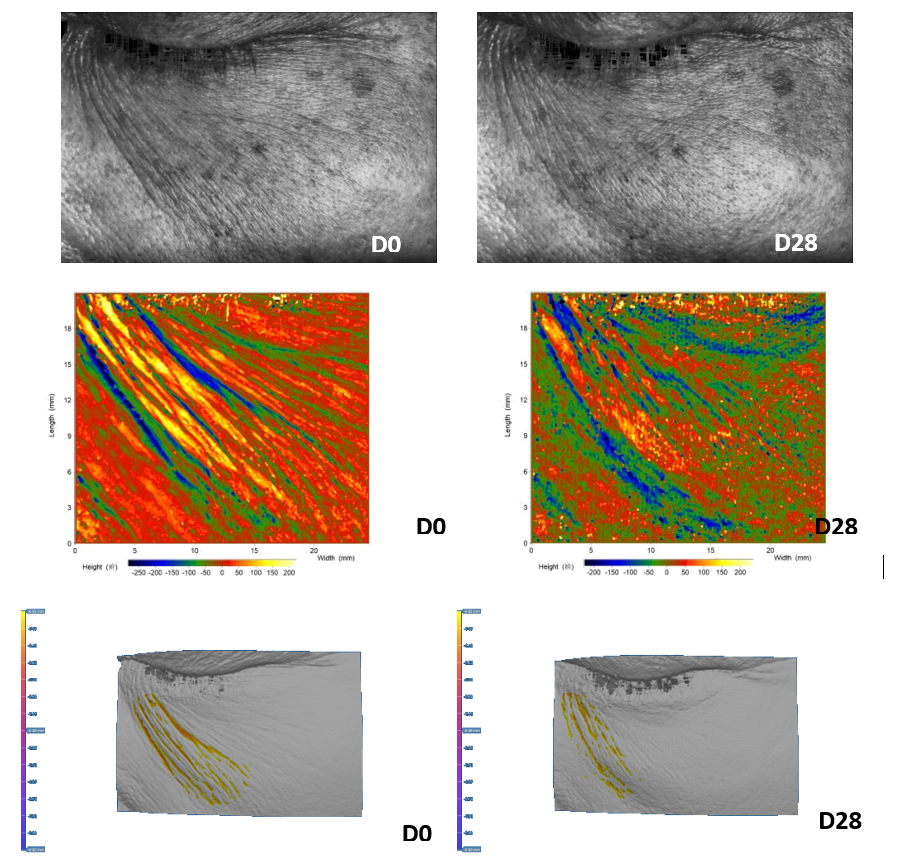 使用Primos-CR條紋光3D掃描系統,捕獲使用產品前后淚溝區域3D圖,分析皺紋參數(數量、深度、面積、體積等),評估淚溝紋改善效果。