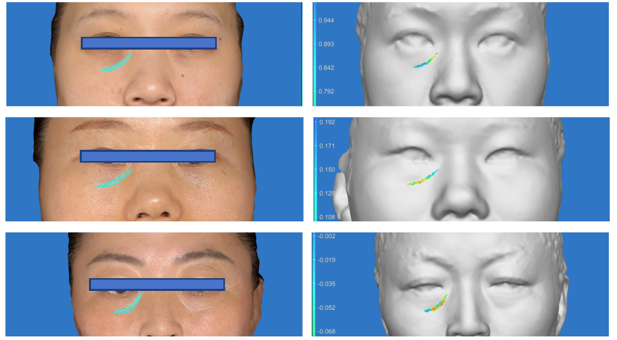 使用VectraH2 3D掃描系統,捕獲使用產品前后面部3D圖,聚焦淚溝區域(往往也會伴有眼袋、黑眼圈問題,注意區分)凹陷體積變化,評估淚溝改善,這取決于產品效果是否顯著,醫療手段會比較明顯。