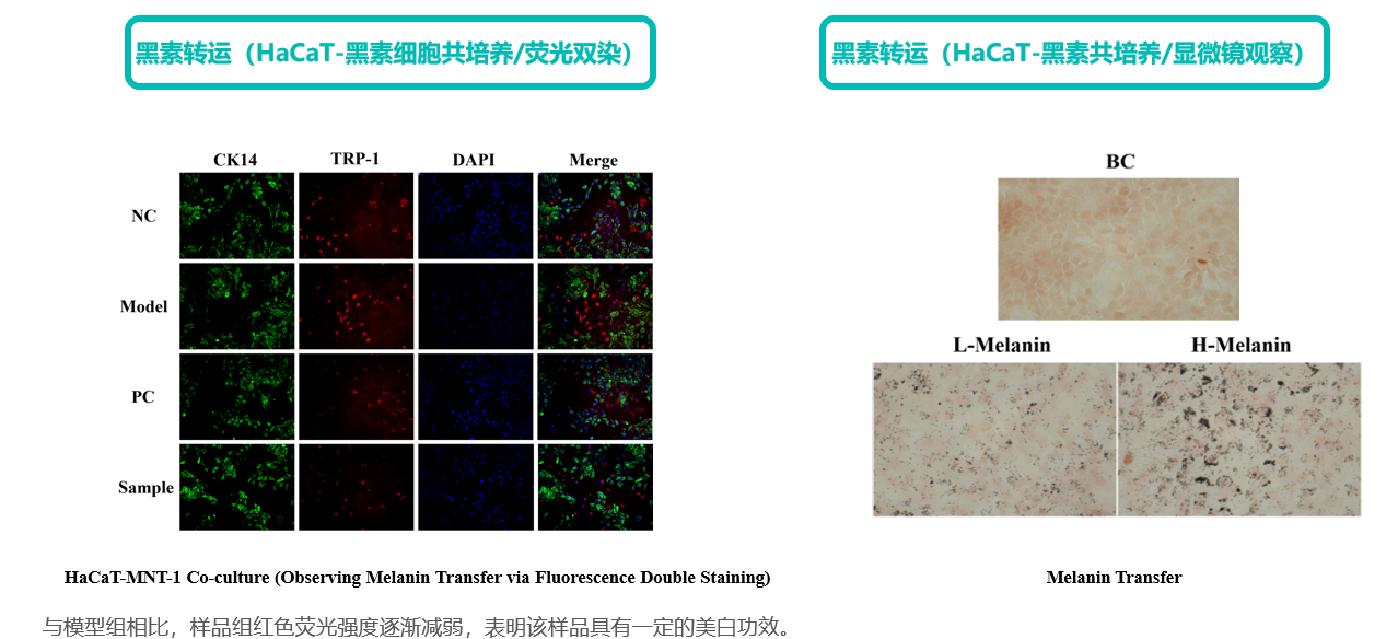 HaCaT-黑素細(xì)胞共培養(yǎng) | 熒光雙染觀察黑素轉(zhuǎn)運(yùn) | 黑素轉(zhuǎn)運(yùn) | IF | |